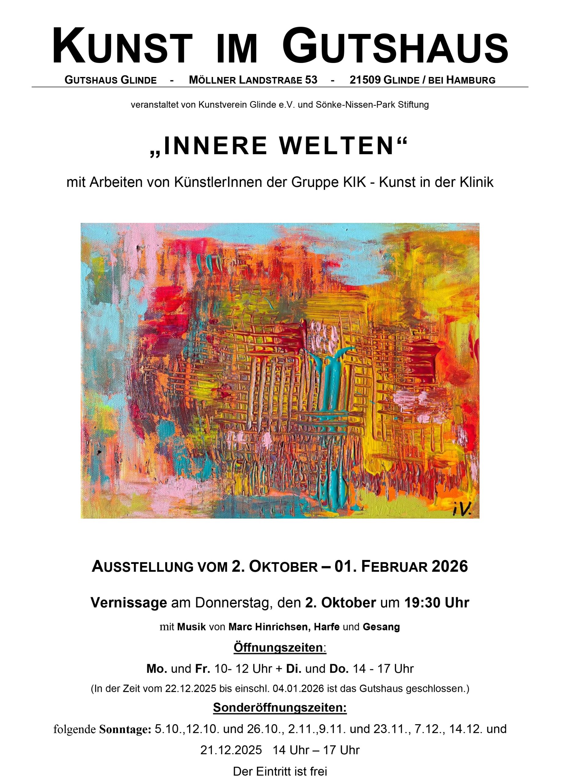 Die Veranstalter von „Kunst im Gutshaus“ – Kunstverein Glinde e.V. und Sönke-Nissen-Park Stiftung – freuen sich sehr, mit der Ausstellung „INNERE WELTEN“ einer Gruppe Menschen in unserer Gesellschaft eine Bühne bieten zu können, auf der sie ihre besonderen, Einblicke in…